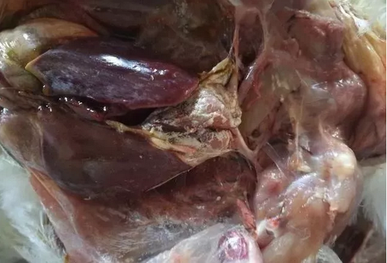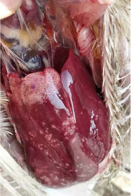 剖檢見肝包膜下有出血點或血泡,嚴重時肝破裂,腹腔內充滿血水或凝血塊。少數(shù)耐過的病例,則冠蒼白、萎縮、衰竭死亡,剖檢見肝表面包裹一層灰白色透明的血漿,腹腔內有血水或凝血塊。