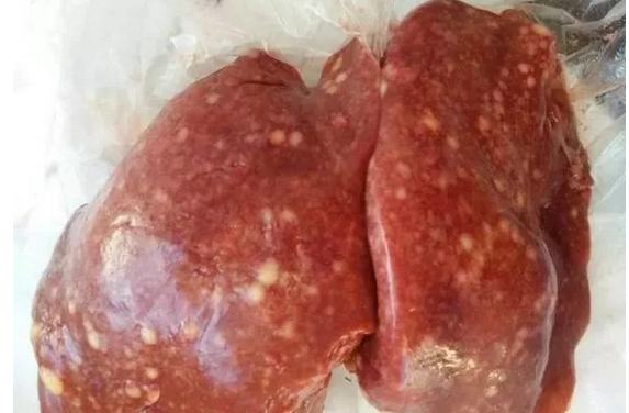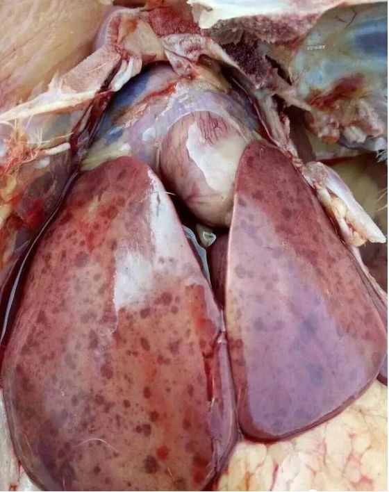 巴氏桿菌病的肝臟腫大,密布有針尖大的白色壞死灶,這也是其他疾病不具備的病變;