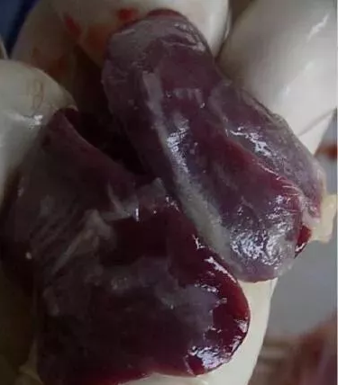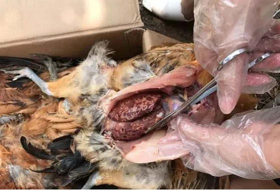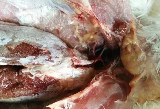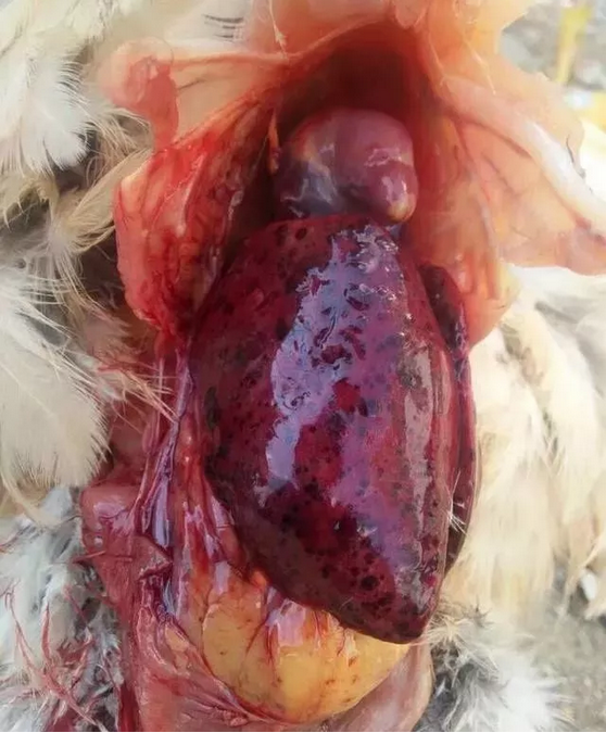 2、禽流感:肝瘀血腫大,有白色點狀壞死灶。產蛋迅速下降,死亡率較高,頭部腫脹,脛部鱗下有出血點,腹腔內充滿卵黃液,輸卵管內有膿樣分泌物,多氣管出血等。