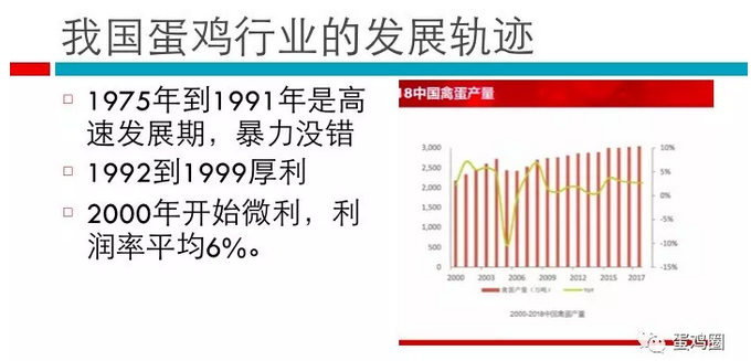 我國(guó)蛋雞行業(yè)的發(fā)展軌跡:1975年到1991年是高速發(fā)展期,暴力沒(méi)錯(cuò),1992到1999厚利,2000年開始微利,利潤(rùn)率平均6%。
